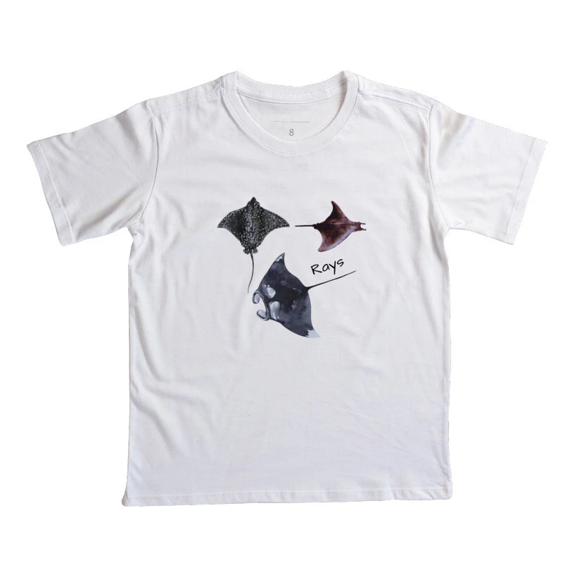 Apresento a nossa camiseta infantil Rays, para você que é fascinado(a) por raias. Camiseta feita em 100% algodão.