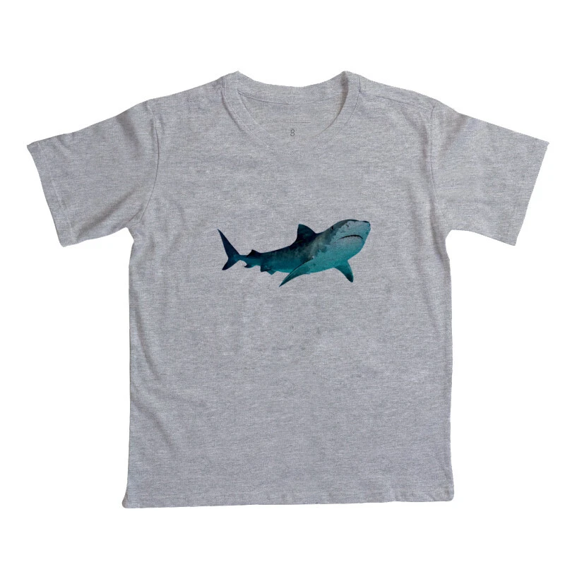 Apresento a nossa camiseta infantil Tiger Shark, para você que é fascinado(a) por tubarões. Camiseta feita em 100% algodão.