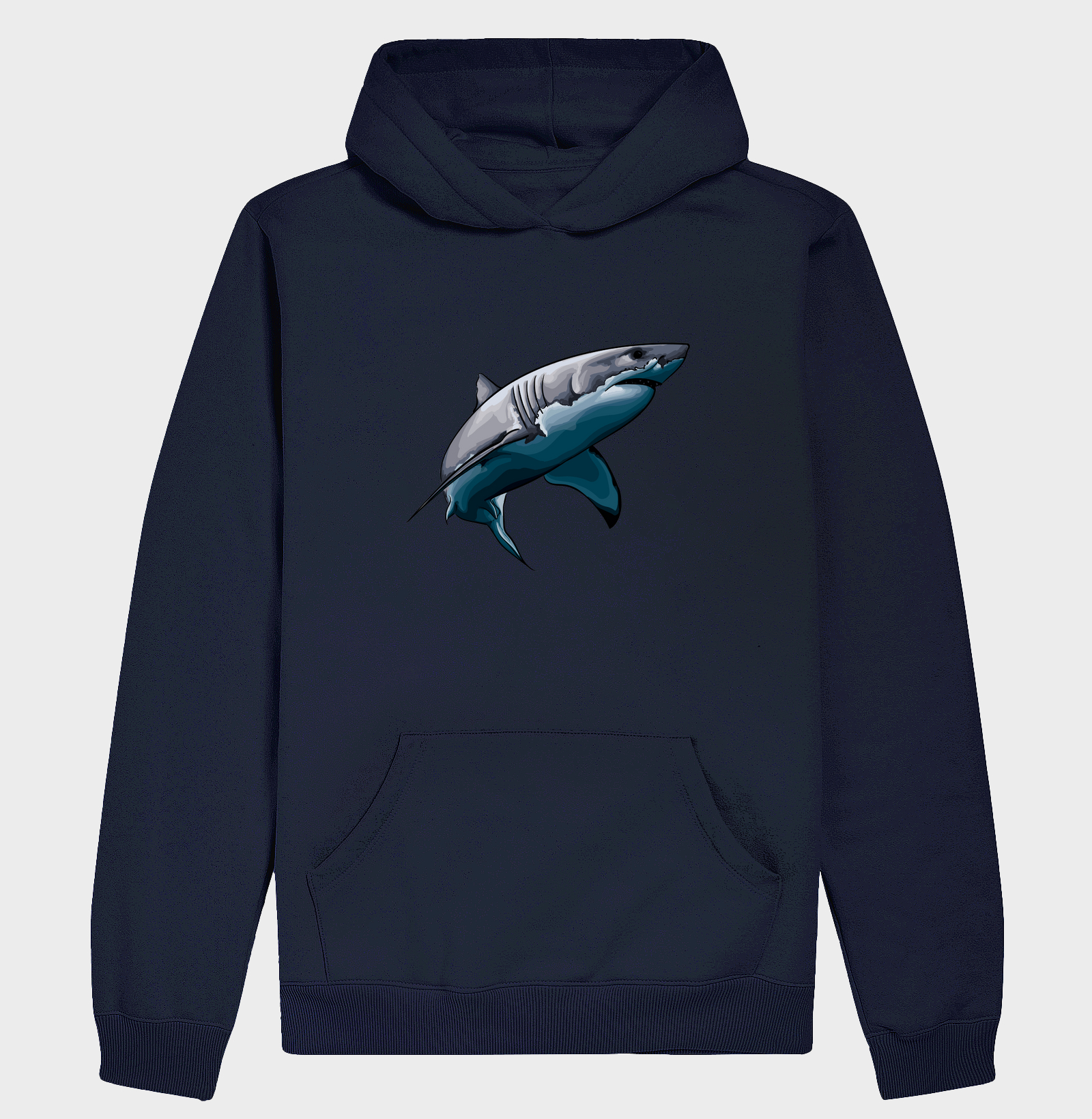 Apresentamos nosso moletom Tubarão Branco, para você que é fascinado(a) por tubarões. Moletom feito com 50% algodão e 50% poliéster.